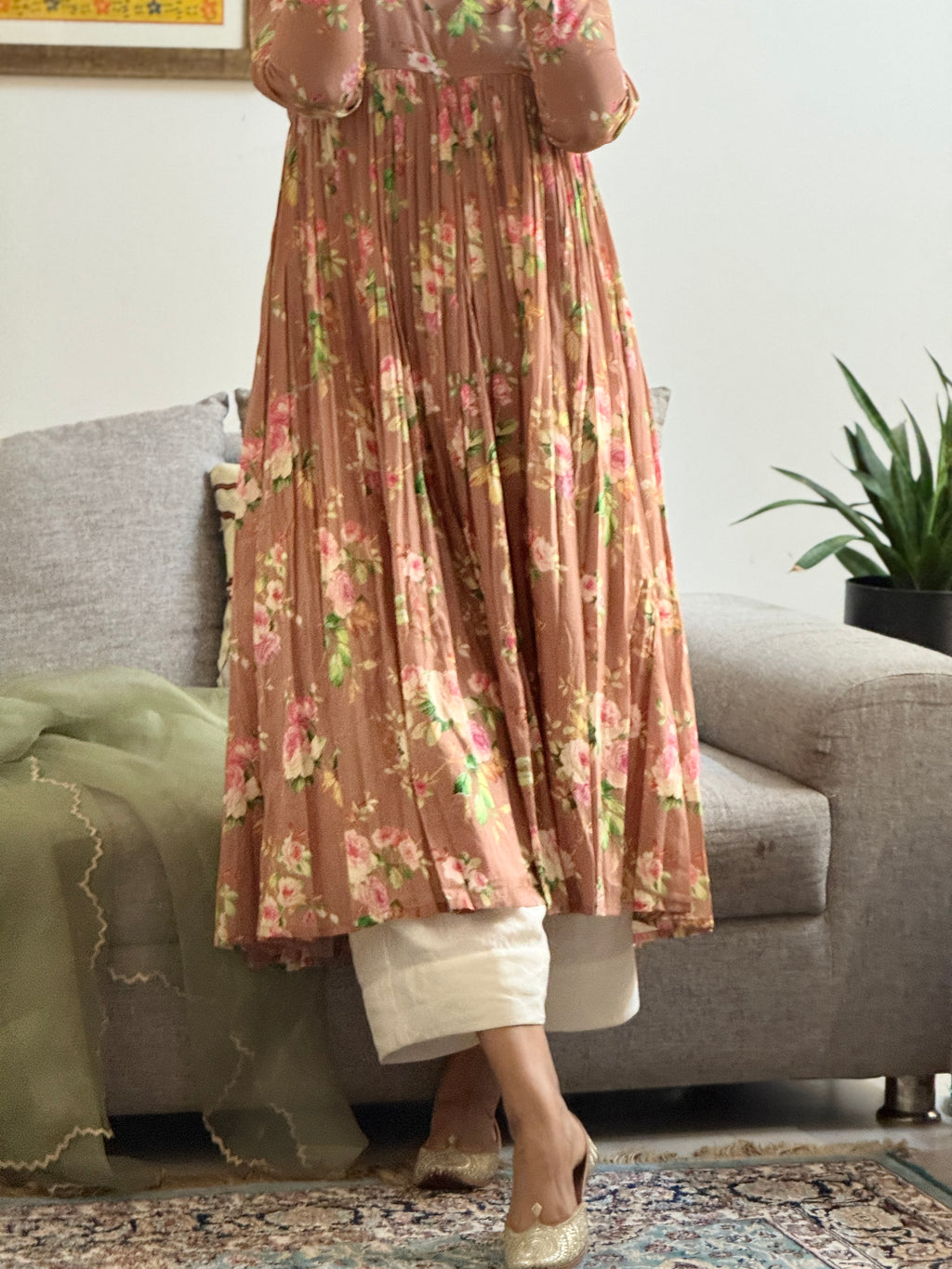 Brown Mul Chanderi Anarkali with churi sleeves Set of 3