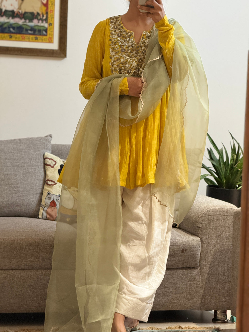 Yellow Mul Chanderi anarkali with churi sleeves Set of 3